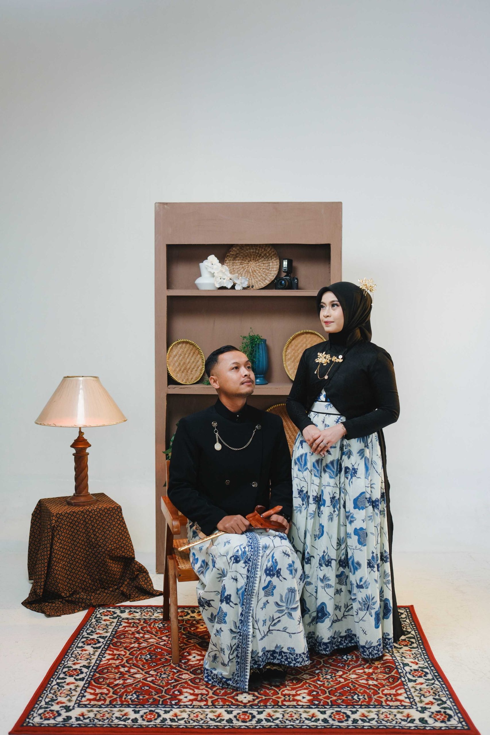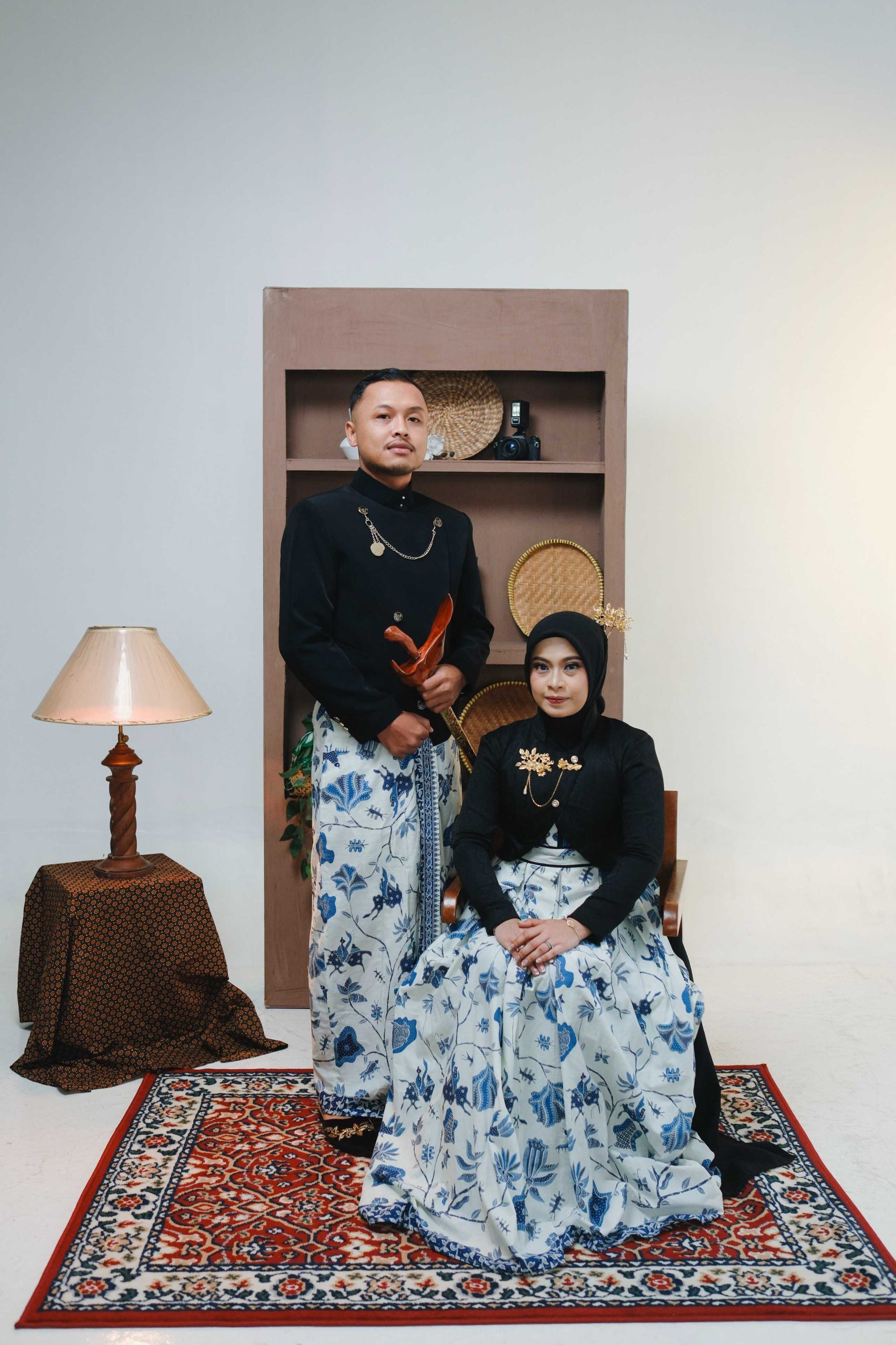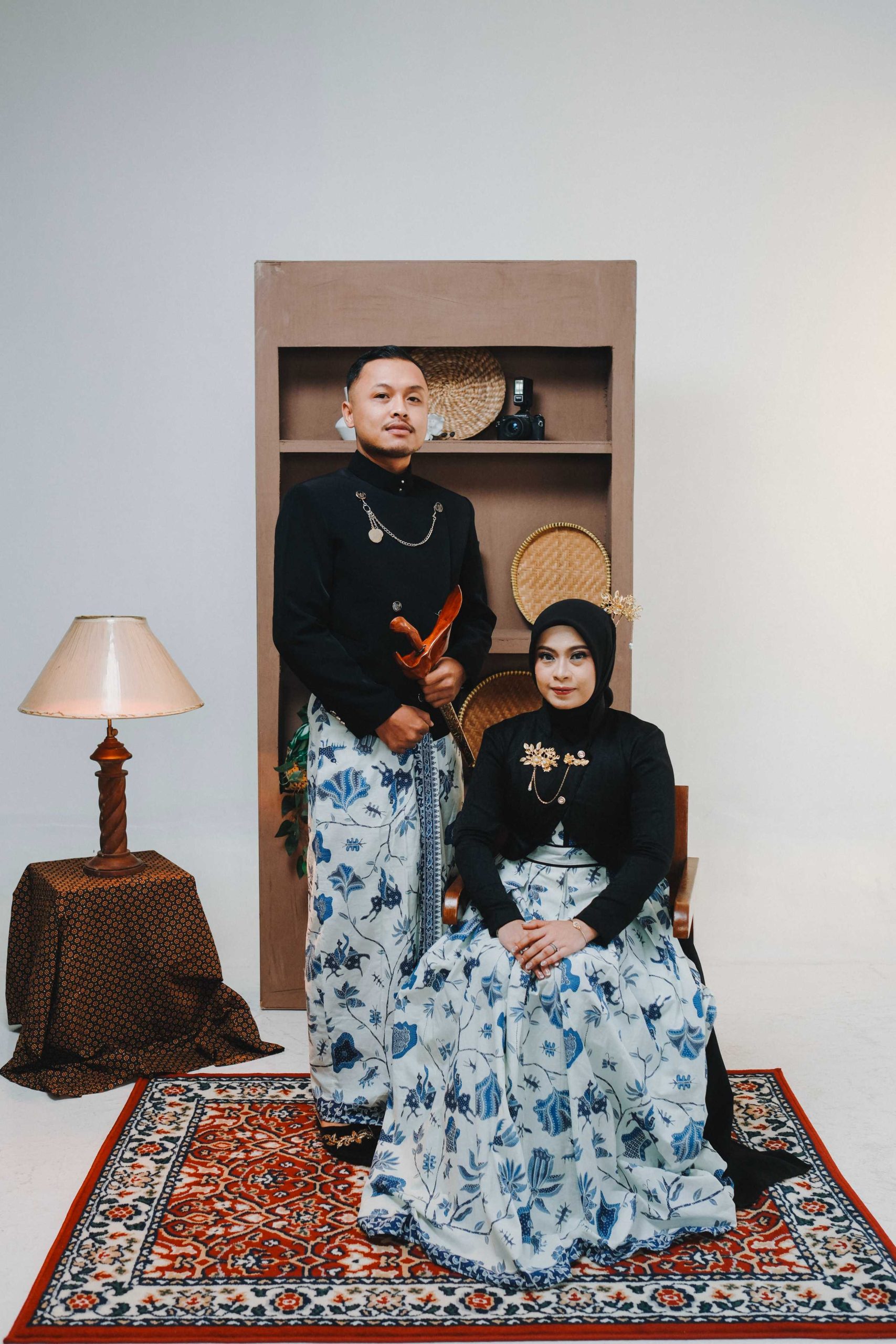 Pilihan Properti: Keris untuk pria, sanggul klasik untuk wanita, dan latar belakang elemen kayu atau dekorasi antik.