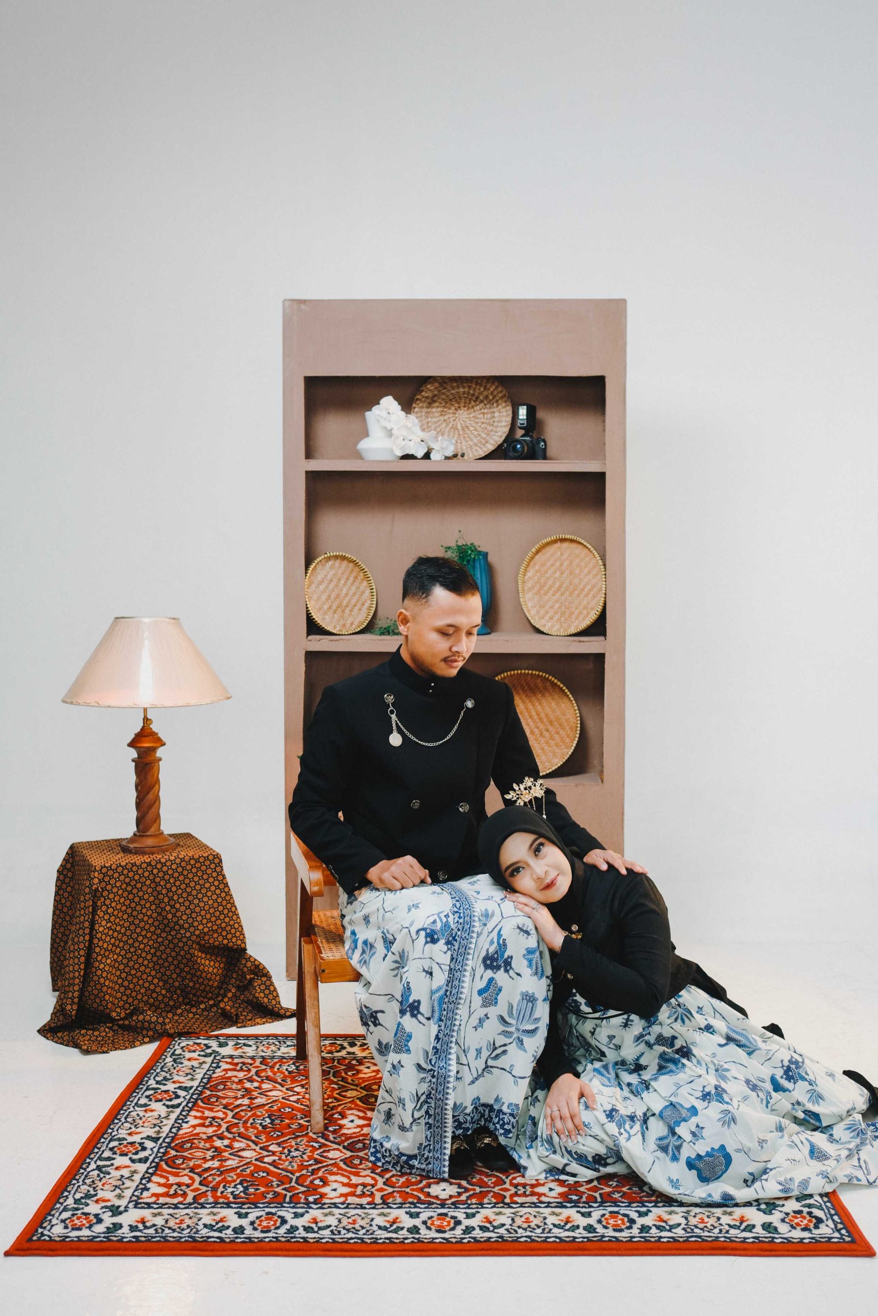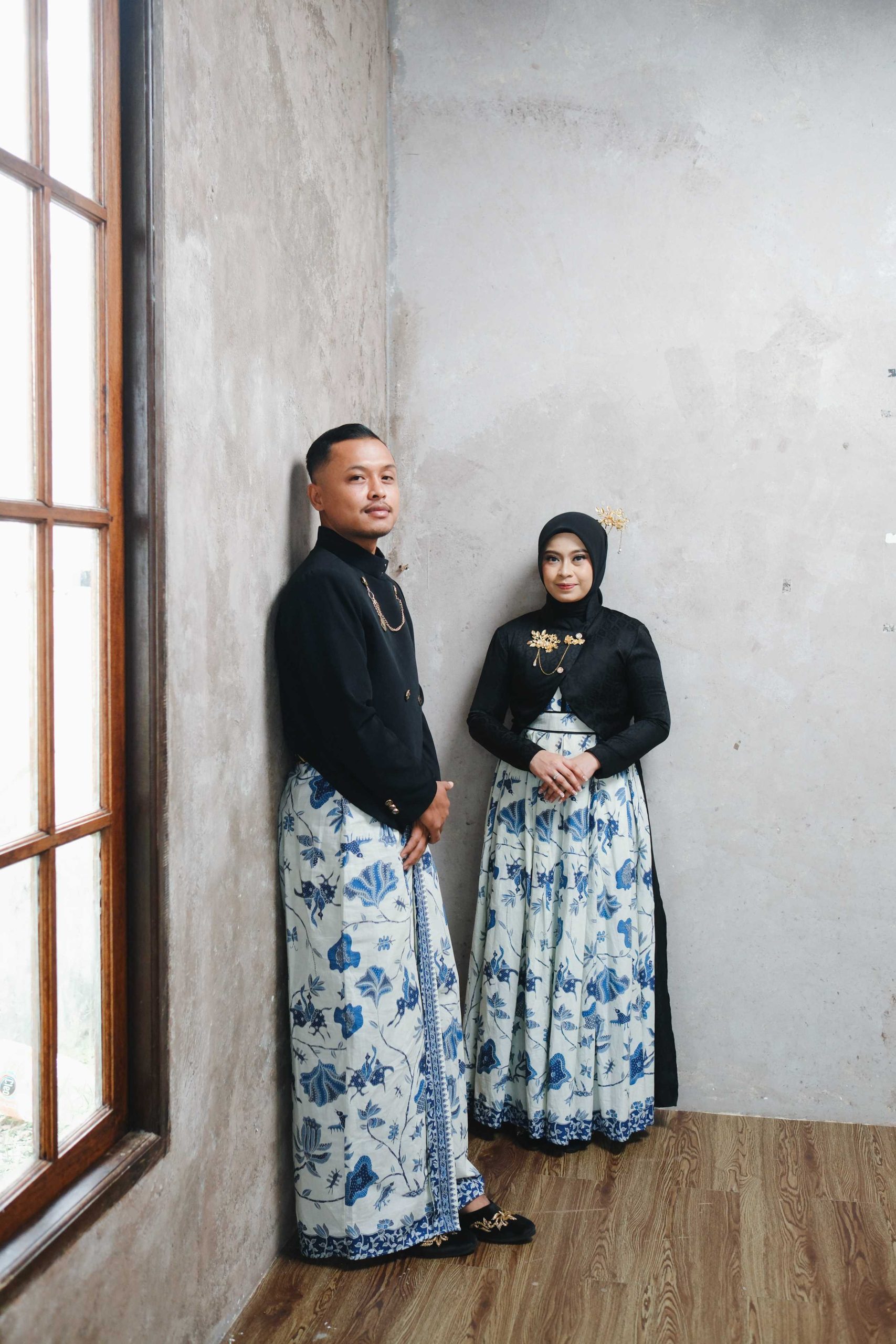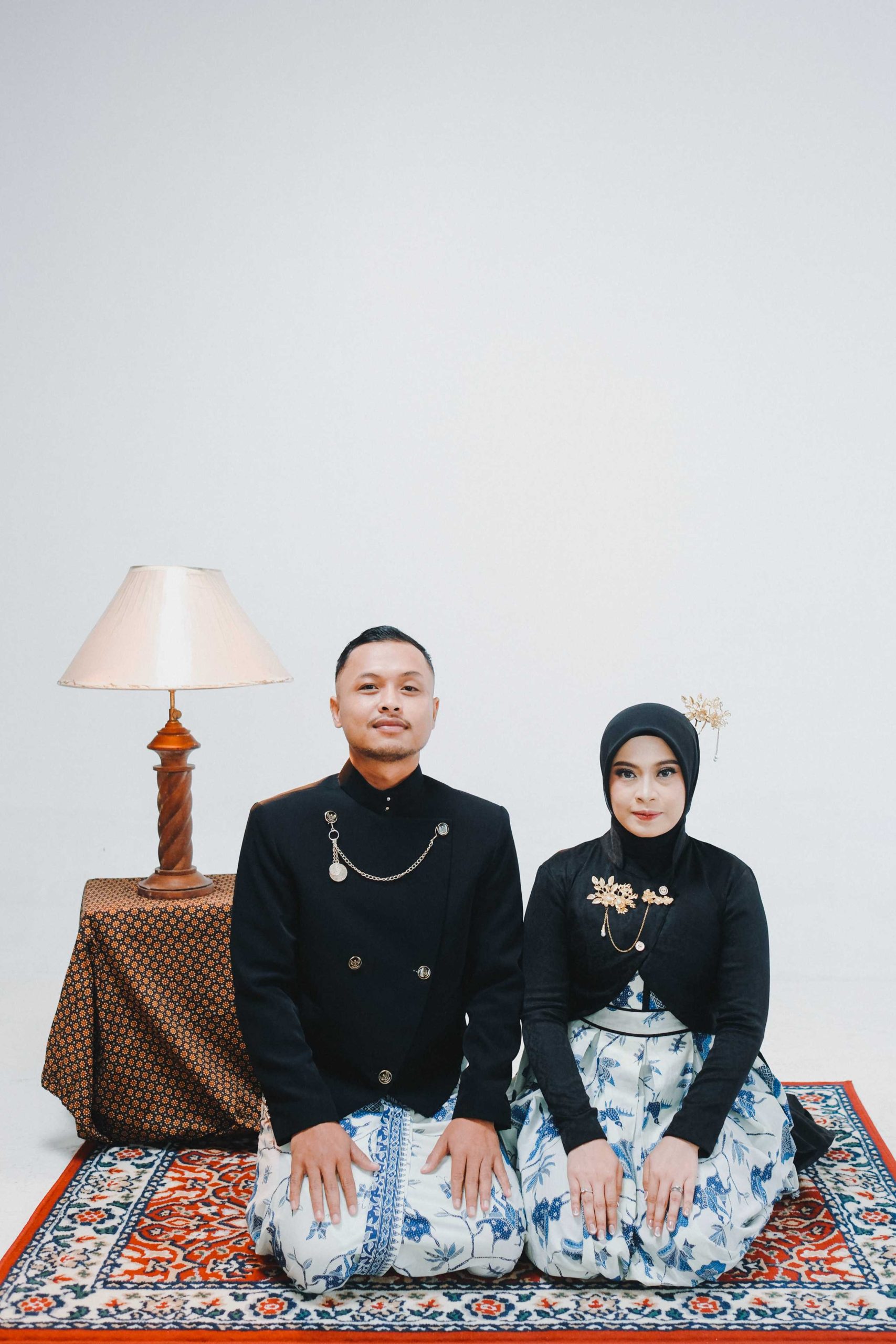 Pilihan Properti: Keris untuk pria, sanggul klasik untuk wanita, dan latar belakang elemen kayu atau dekorasi antik.